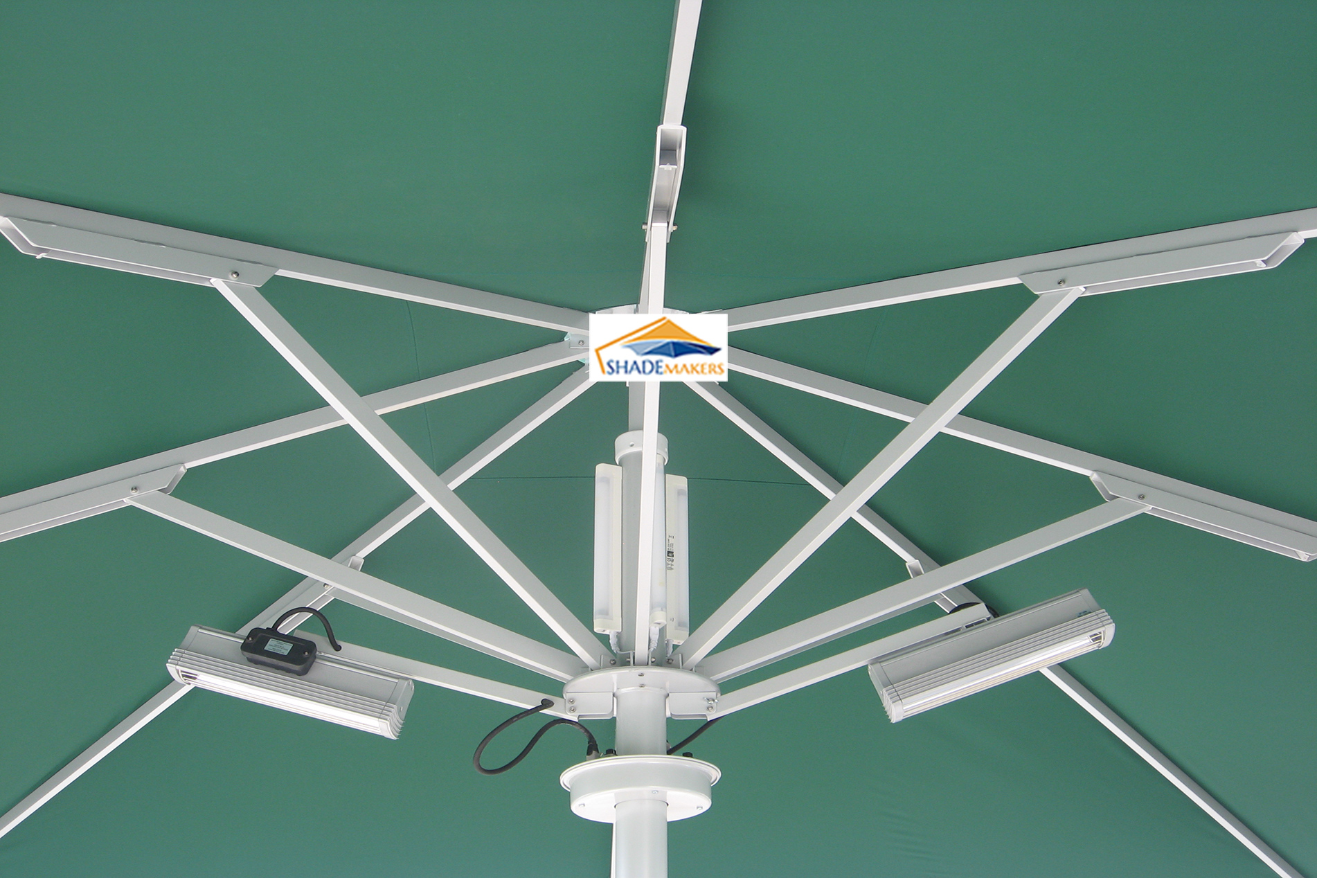 We also provide our Smart Hubs designed for use on all our parasols which enable ONE electrical supply cable (which we provide) to feed up to 4 radiant heaters and a set of LED lights. Each of our heaters is manufactured using specially coded safety plugs, custom brackets and painted to our chosen paint RAL. They can be attached or detached from the parasol within minutes. LEDs can be supplied as detachable stainless 240V spot lamps with custom brackets and coded plugs or as strip lights within the main arms for plain canopies only. Our Smart Hubs are a safe and efficient solution to heating and adding light to your parasol.